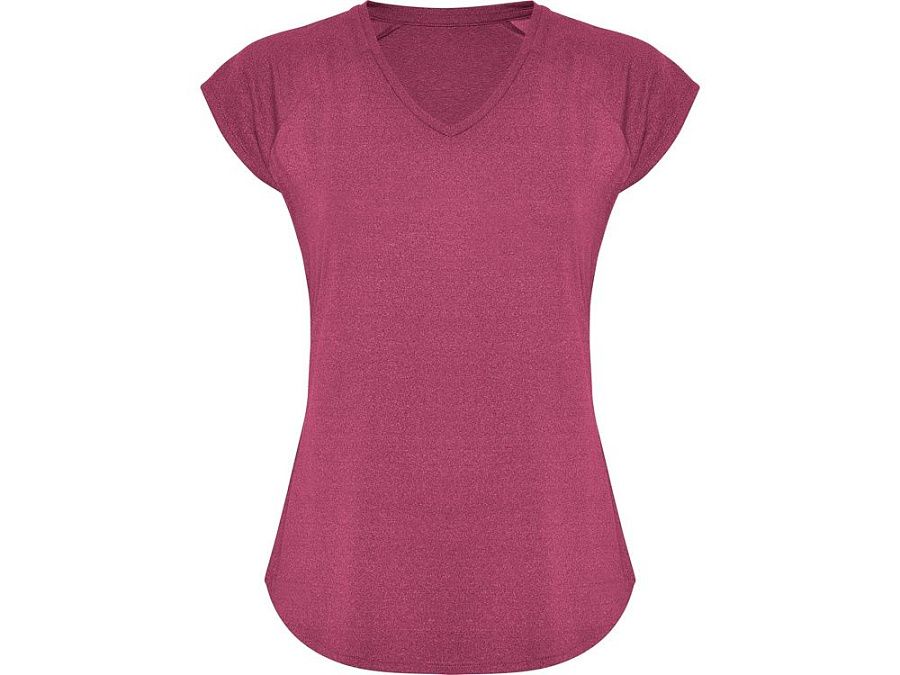 Спортивная женская футболка с коротким рукавом реглан. Вырез горловины V. Полотно из полиэстера на ощупь напоминающее хлопок. Приталенный силуэт.