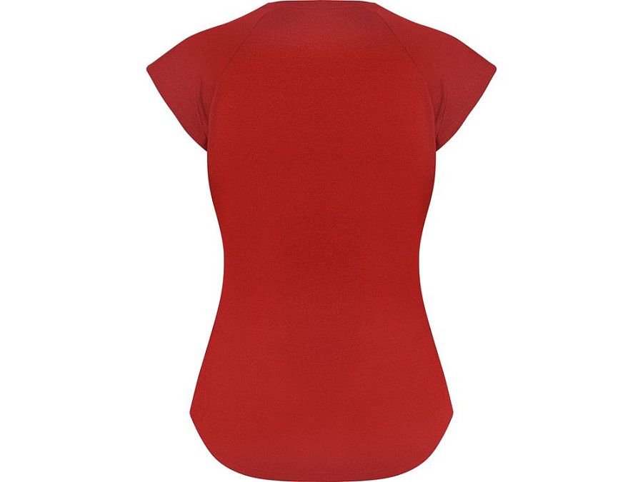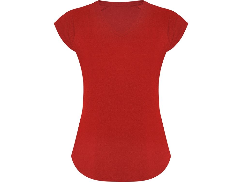 Спортивная женская футболка с коротким рукавом реглан. Вырез горловины V. Полотно из полиэстера на ощупь напоминающее хлопок. Приталенный силуэт.