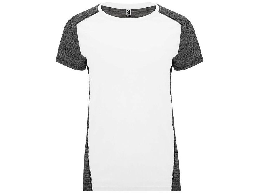 Футболка с коротким рукавом из технологического полотна. Круглый вырез горловины. Комбинация двух полиэстеровых полотен. Основное полотно на полочке со структурой, дополнительное полотно на спинке, рукавах и плечах с меланжевым эффектом. Задняя часть немного длиннее. Легко сохнущее дышащее полотно.