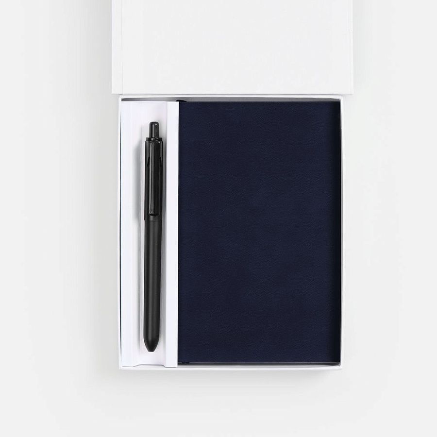 Миниатюрный набор со стильным ежедневником в гибкой обложке с покрытием софт-тач и ручкой интересной формы. Все составляющие сложены в компактную коробку с ложементом, которая придает набору аккуратность.