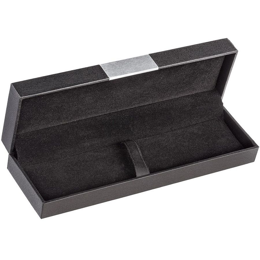 На крышке футляра алюминиевая матовая вставка, на которую можно нанести УФ печать или гравировку. Ложемент из мягкого флока черного цвета. Ручки закрепляются под широкой черной лентой резинками черного цвета.