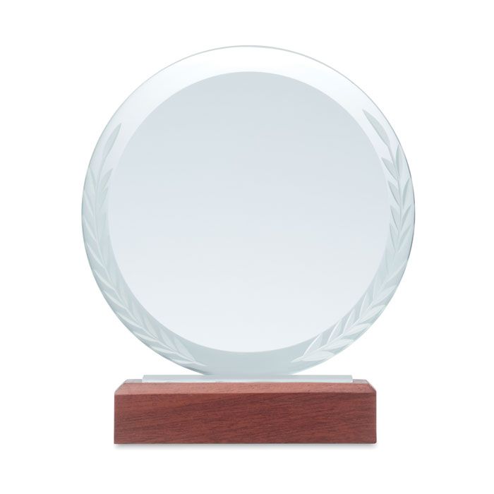 Круглая хрустальная награда на деревянном основании из бука в подарочной коробке.