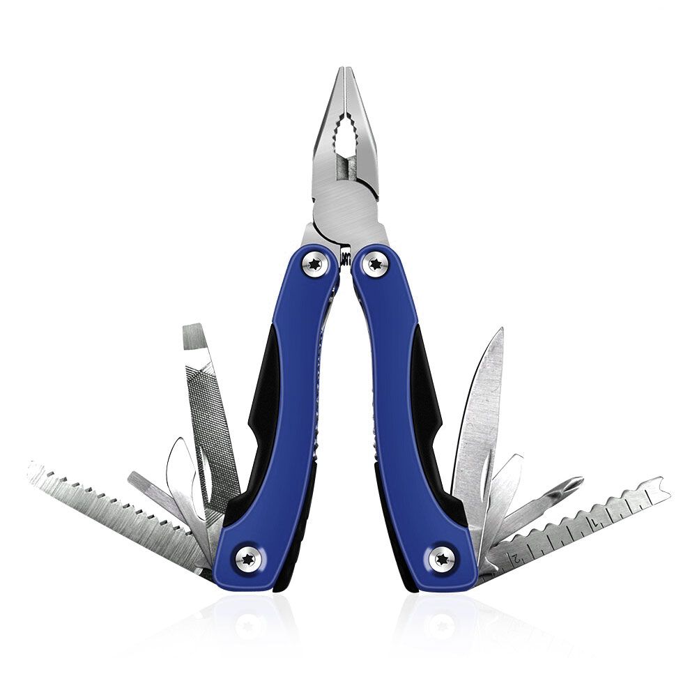 - Функции: Плоскогубцы, Кусачки, Консервный нож, Открывалка для бутылок, Средняя и маленькая плоские отвертки, Крестовая отвертка, Гладкое лезвие, Зубчатое лезвие, Пила, Напильник