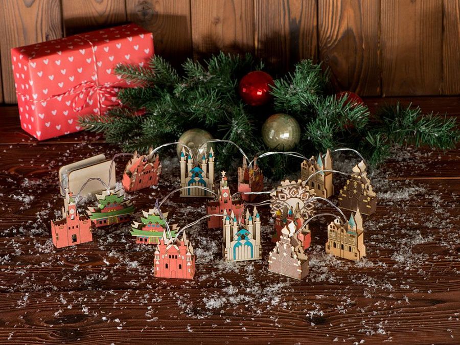 Новогодняя ёлочная гирлянда постоянного свечения с цветными фигурками достопримечательностей из натуральной березовой фанеры сделает процесс украшения ёлки или дома не только увлекательным, но и познавательным!