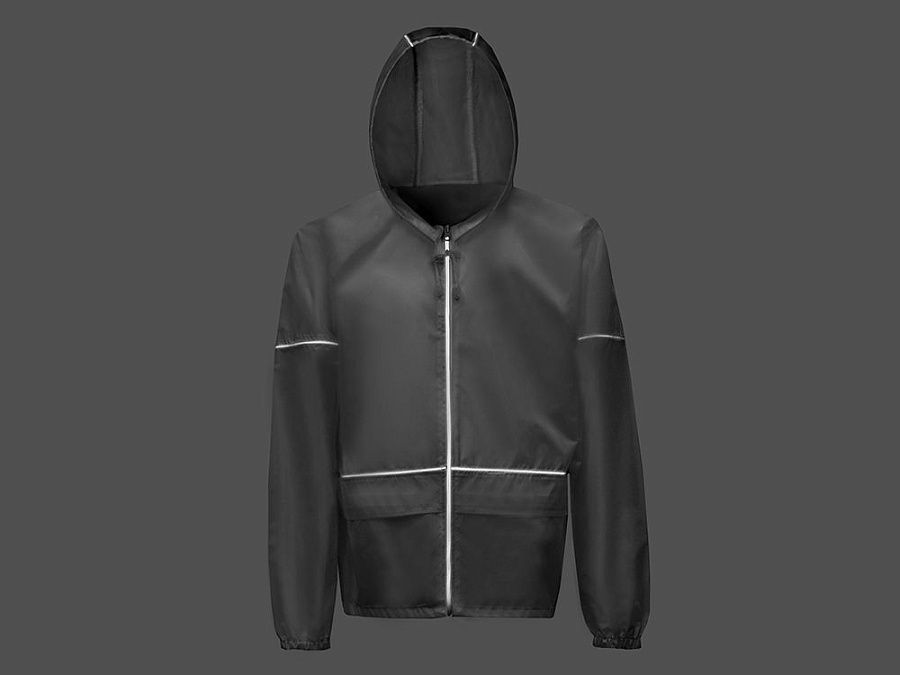 Короткий дождевик прямого силуэта с капюшоном и карманами. Вместительные накладные карманы защищены сверху клапанами, по верхней кромке которых вшит светоотражающий кант. Светоотражающие элементы также расположены на рукавах, капюшоне и молнии, что делает человека заметным даже в темное время суток.