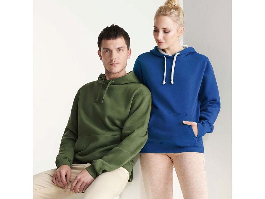 Худи с капюшоном и шнурками. Отделка горловины спинки внутри тесьмой, Риб 1х1 по низу изделия и манжетам. Карман кенгуру. На манжетах вырез под большой палец