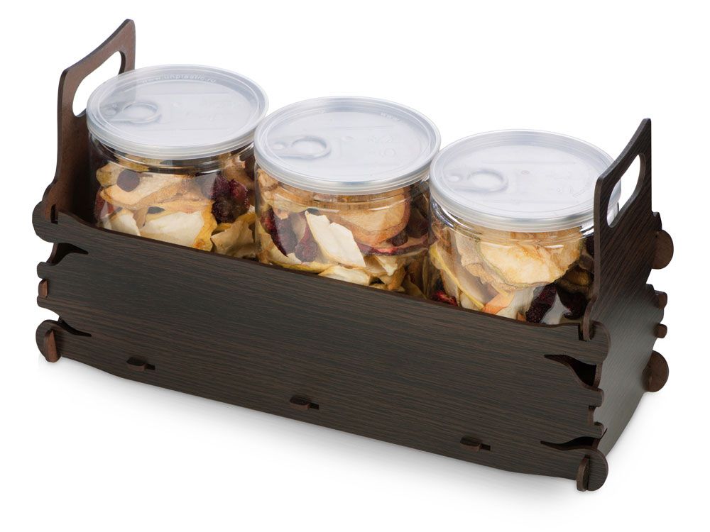 Мы красиво упаковали этот набор в корзинку-переноску из переработанной древесины, которую можно брендировать несколькими методами, и которая станет полезным, красивым и долговечным аксессуаром в доме. Чипсы упакованы в брендируемые наклейками пластиковые банки, которые можно использовать для хранения любых пищевых и непищевых предметов благодаря удобной форме и наличию плотно закрывающейся полиэтиленовой крышки.