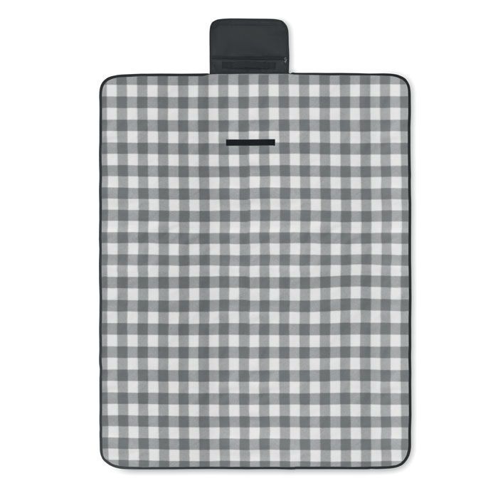 Складывающийся плед для пикника из флиса RPET 150 гр/м² с водостойким покрытием PEVA с обратной стороны. Включает передний карман на молнии и короткий ремень для переноски.