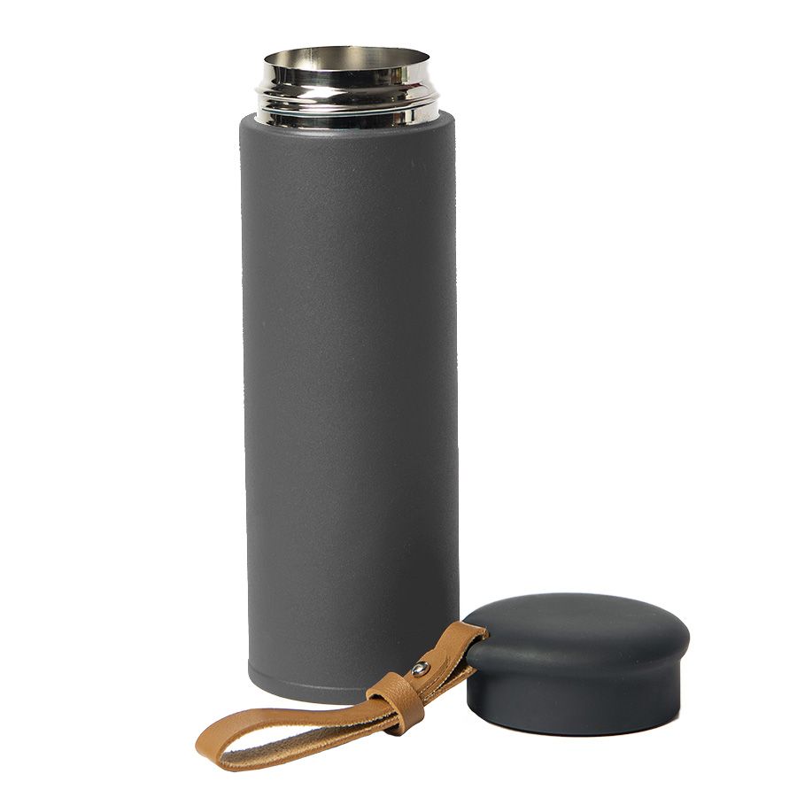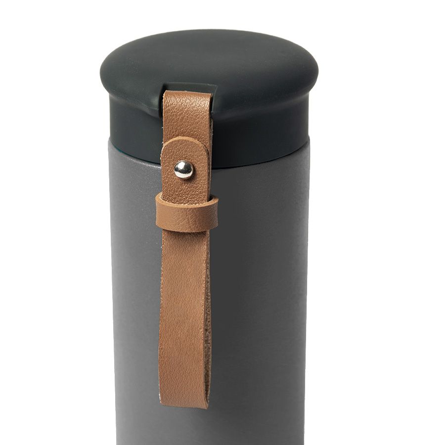 Вакуумный термос STRIPE с двойными стальными стенкамиСтильный матовый корпус термоса из нержавеющей стали (марка 304)Удобный ремешок из искусственной кожи, подходит для персонализацииГерметичная крышка с покрытием soft-touch не даст напитку пролитьсяСохраняет температуру жидкости до 12 часов в зависимости от температуры окружающей среды.Цвет близкий к Pantone 425CИндивидуальная упаковка из крафтового картона