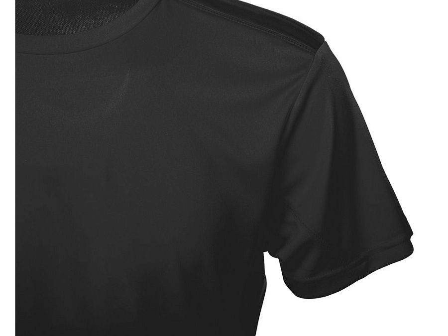 Мужская спортивная футболка выполнена из двух разных видов полотна: спинка и перед из интерлока имеют гладкую поверхность, а декоративные вставки выполнены из спортивной сетки ячеистой структуры. Благодаря наличию таких вставок воздух свободно проникает под футболку, охлаждая кожу во время спортивных нагрузок.