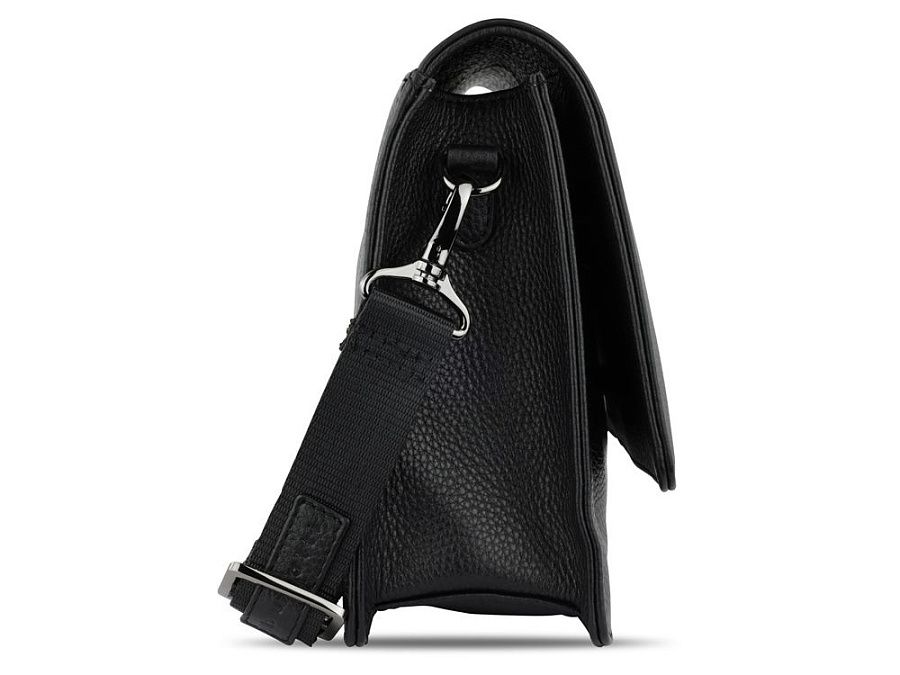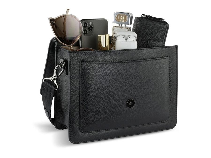 Функциональная организация: основное отделение на магнитной кнопке с карманом на молнии и открытым карманом, передний открытый карман, задний карман на молнии, съемный регулируемый плечевой ремень (до 130 см).