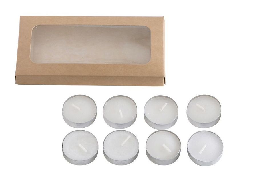Свечи выполнены из белого воска без запаха, упакованы в крафтовую коробку с прозрачным окошком и перевязаны шелковистой ленточкой. В каждой коробке — 8 свечей.