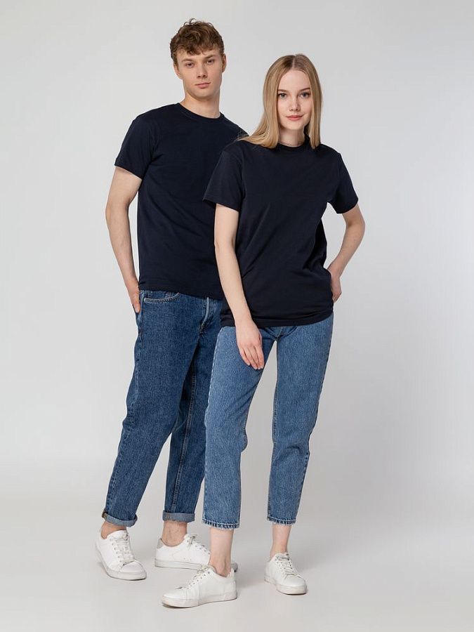 Базовая футболка унисекс прямого силуэта без боковых швов (размеры XS–4XL) или с боковыми швами (размеры 5XL–6XL).