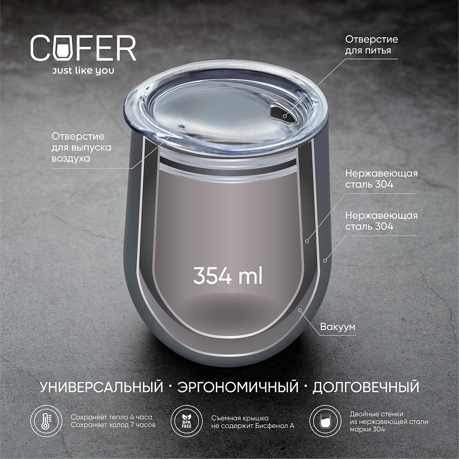 Кофер—это емкость для питья нестандартной формы, которая сохраняет холод и тепло за счет двойных стенок из пищевой стали и вакуума между ними.