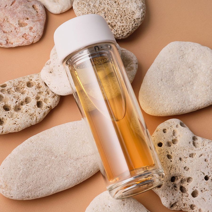 Стеклянная бутылка с двойными стенками позволит носить свежезаваренный чай с собой. Ситечко позволит заварить чай прямо в бутылке.