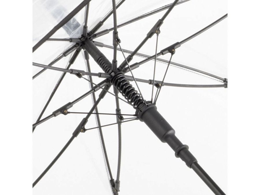Зонт-трость с прозрачным куполом и контрастными деталями легко открывается нажатием кнопки на ручке. Каркас выполнен из прочной долговечной гальванизированной стали. Благодаря гибким спицам из стекловолокна зонту не страшны порывы ветра.