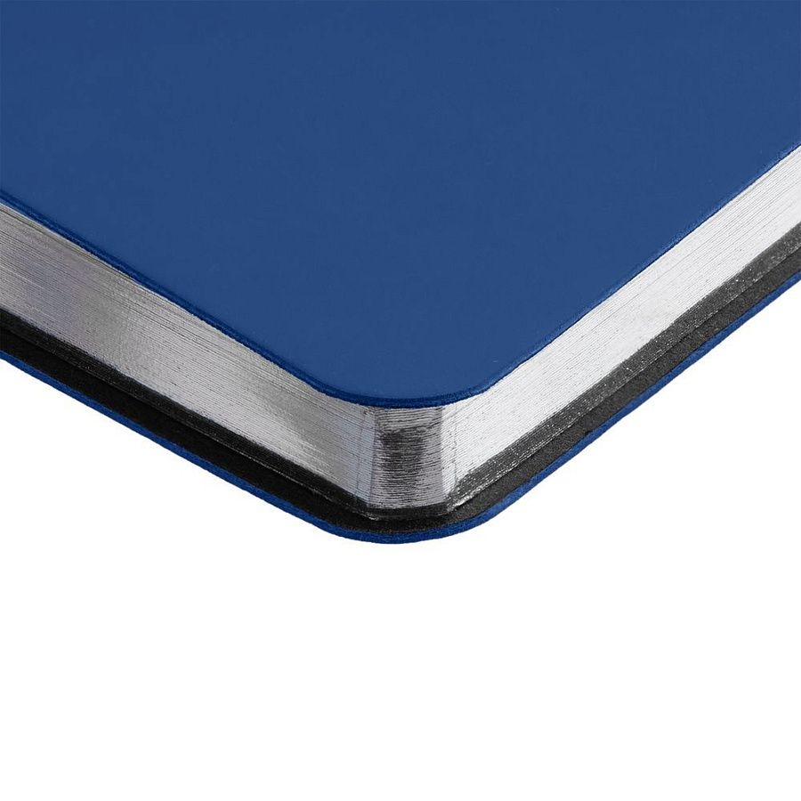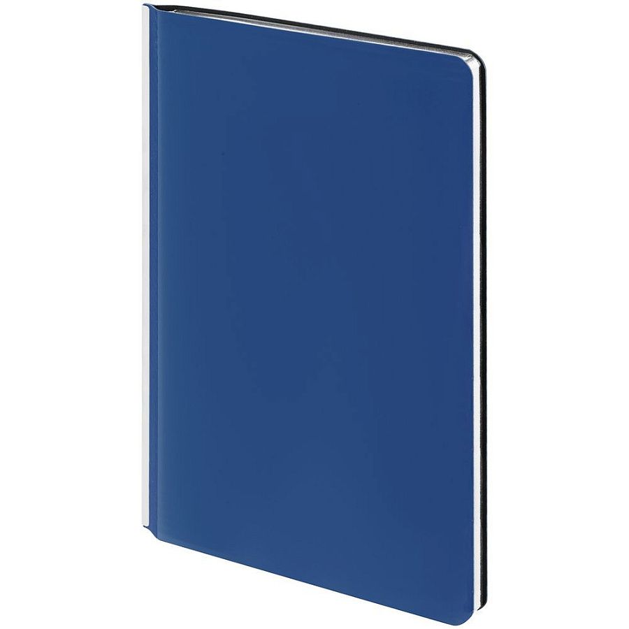 Ежедневник с гибкой обложкой и металлическим корешком, выполнен из материала Soft Touch Ultra, синий НН, дополнен серебристым обрезом блока и ляссе.