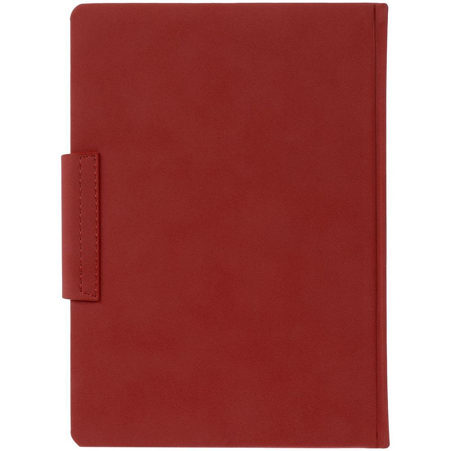 Ежедневник с твердой обложкой c поролоном, выполнен из материала Nubuck, красный РР, дополнен капталом и ляссе в цвет обложки. Застежка — хлястик на магните.