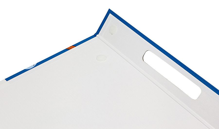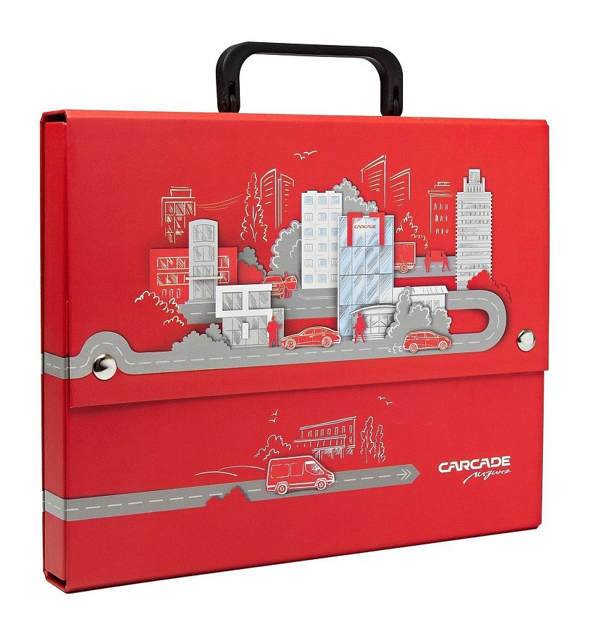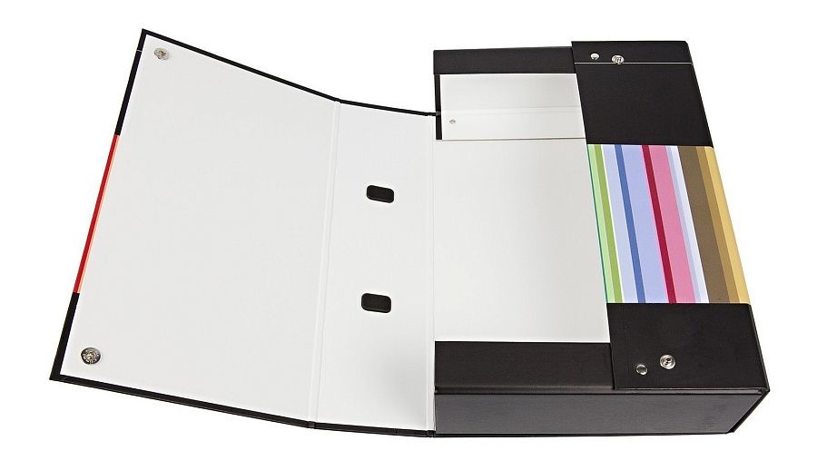 Брендированные портфели с пластиковой ручкой для переноски из кашированного переплётного картона на заказ с кнопками защелками.
