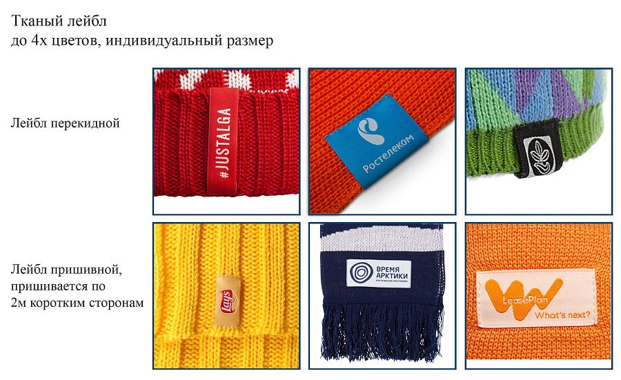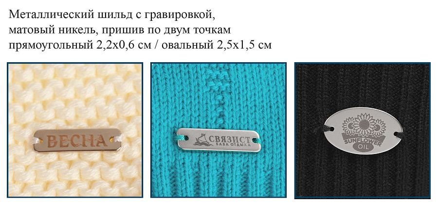– тканый лейбл (4х2 см), кол-во цветов до 4 / ПВХ лейбл(35х15 мм), кол-во цветов до 3 / кожаный лейбл с блинтовым тиснением, натуральная кожа, пришив по четырем точкам, цвет коричневый/бежевый, размер 40х25 мм / 70х50 мм / 95х43 мм /  металлический шильд с гравировкой, овальный / прямоугольный, матовый никель, пришив по двум точкам – макет приложить;