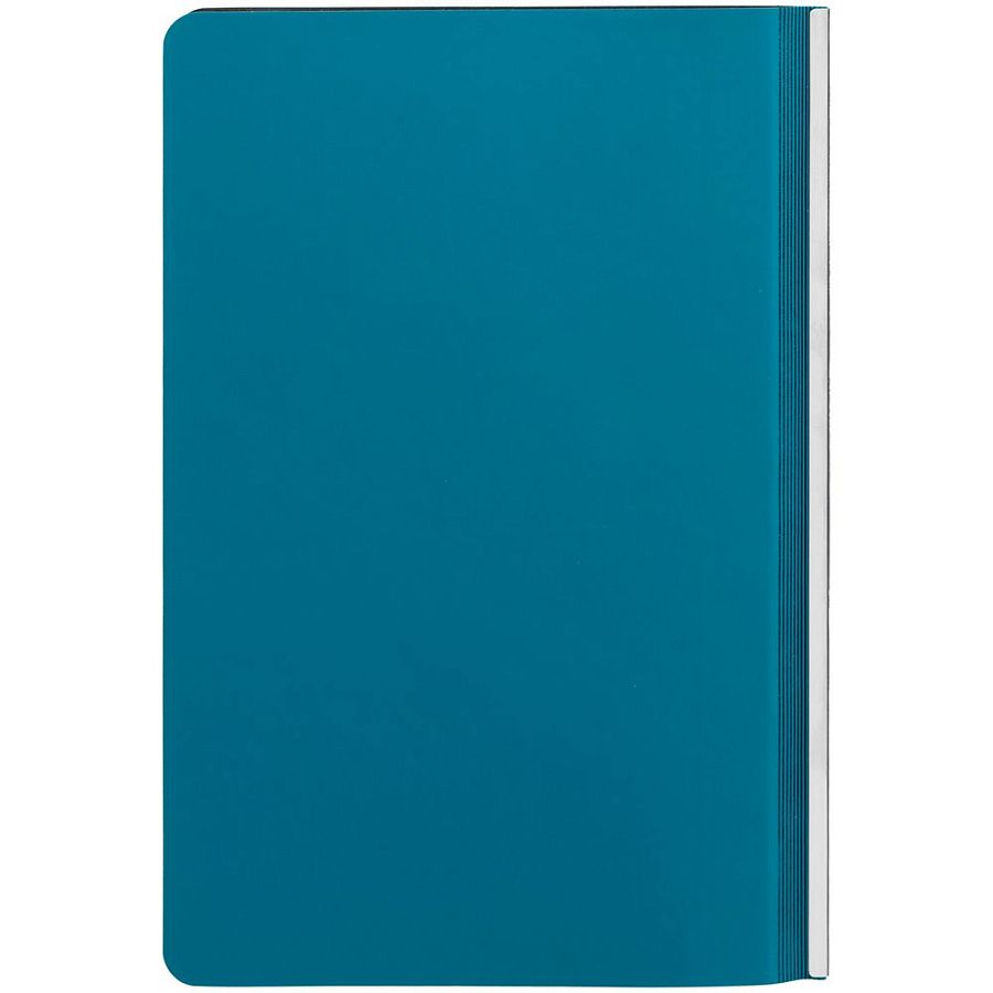Ежедневник с гибкой обложкой и металлическим корешком, выполнен из материала Soft Touch, цвета морской волны II, дополнен серебристым обрезом блока и ляссе.