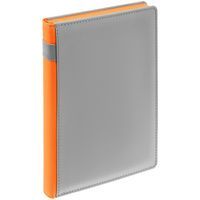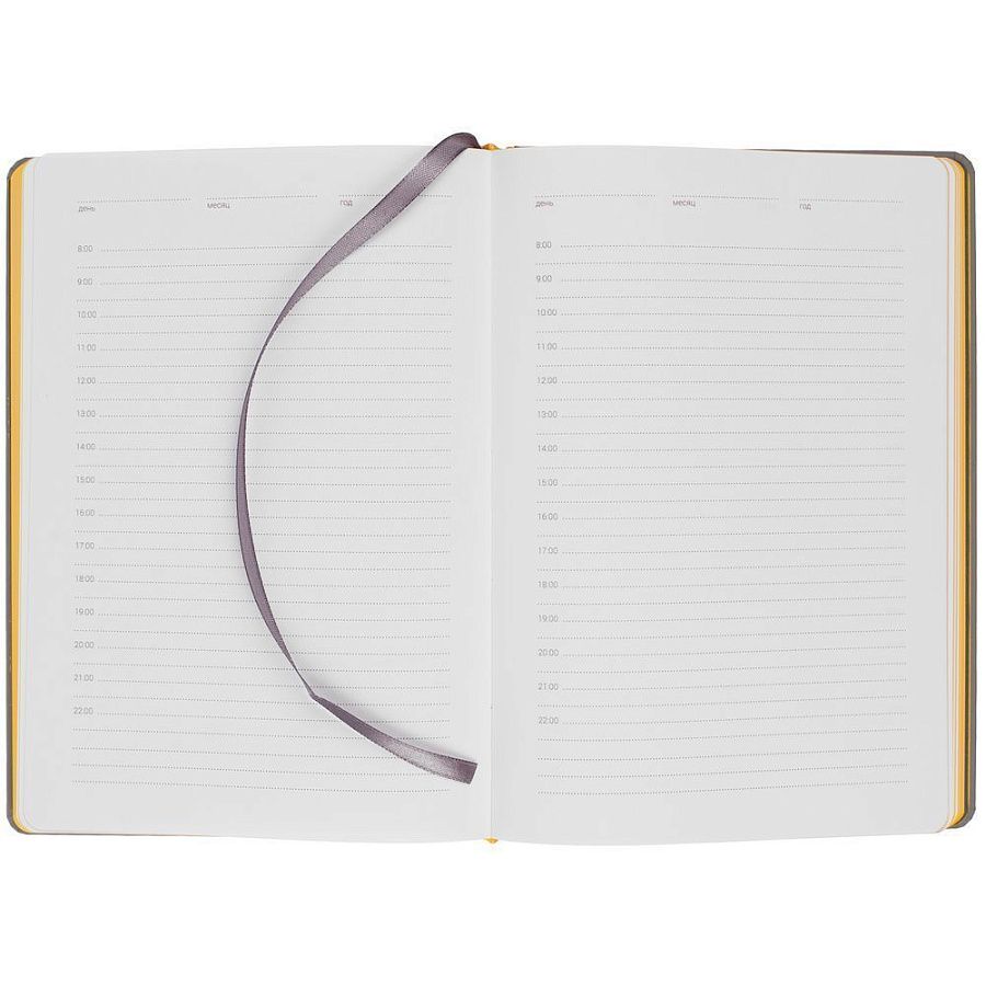 Твердая обложка с поролоном, материал обложки — Soft Touch, серый СС и Soft Touch, желтый КК. На корешке ежедневника находится петля из резинки.
