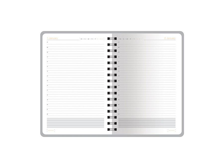 Гибкая (flex) обложка из фактурной высококачественной экокожи, скругленный угол обложки и блока, полускрытый гребень, позволяющий держать ежедневник открытым на столе и работать с комфортом, делая записи, серебряный обрез - все это визитная карточка ежедневника ORBIT от Bruno Visconti.