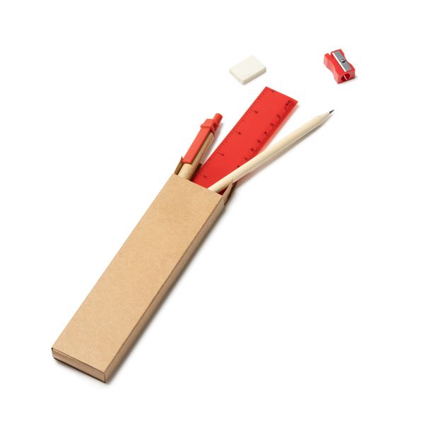 Набор из 5 предметов, включающий шариковую ручку с картонным корпусом и синими чернилами, деревянный карандаш, точилку, резинку и линейку 15 см.
