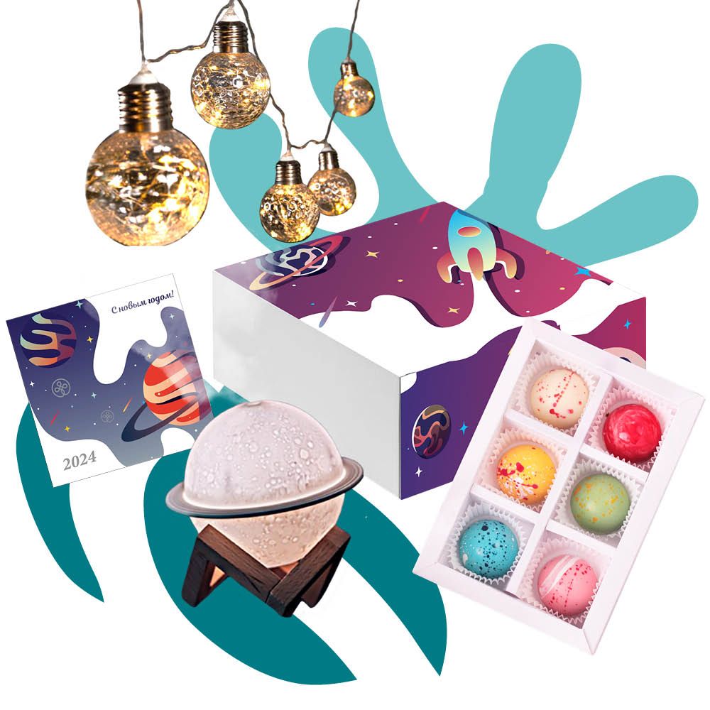 Конфеты в виде планет ручной работы - станут приятным дополнением к подарку. Они упакованы в красивую коробку, которая станет отличным украшением праздничного стола.