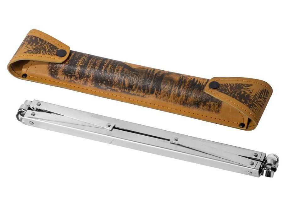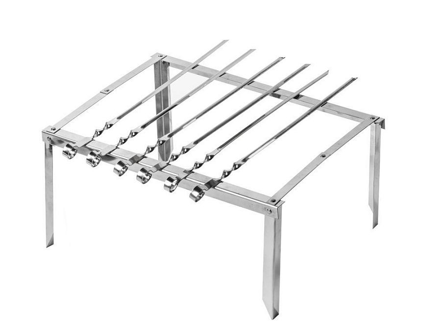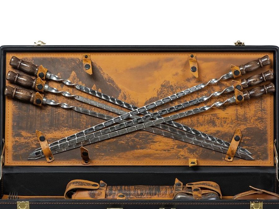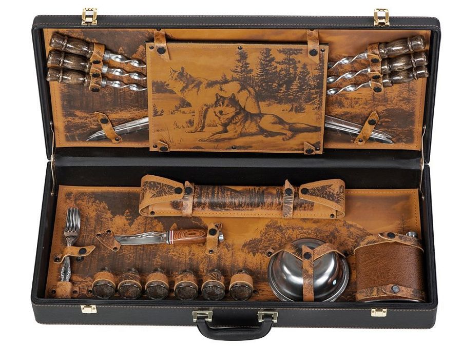 шампура большие- 6 шт, доска разделочная, вилка- 6 шт, нож, стопка- 6 шт, тарелка- 6 шт, фляга, шампура мленькие- 6 шт, мангал