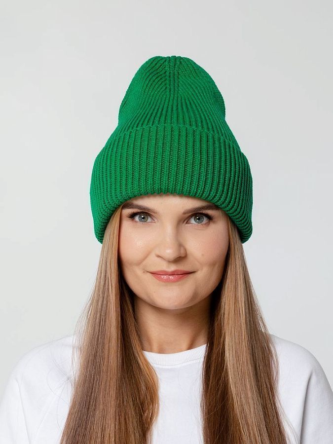 Удлиненная шапка объемной фактурной вязки с отворотом.