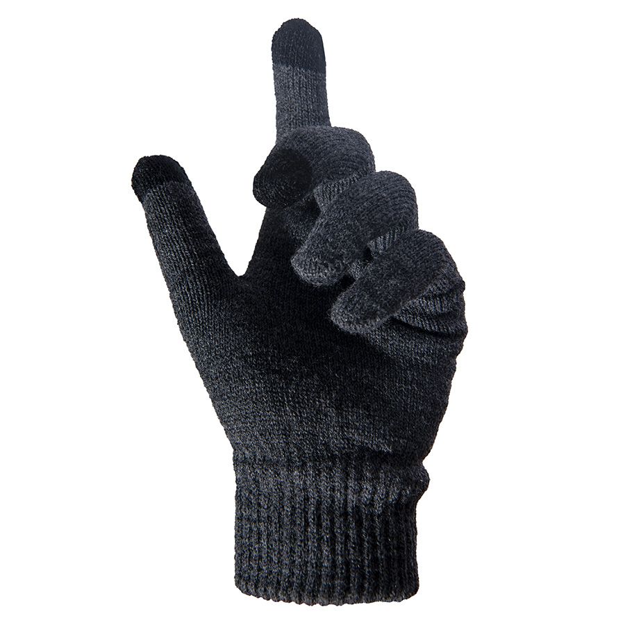Перчатки из теплого и мягкого акрила с сенсорными наконечниками. Основной цвет: темно-серый меланж. Цвет сенсорных вставок: черный. Цвет, близкий к Pantone Cool Grey 11C.