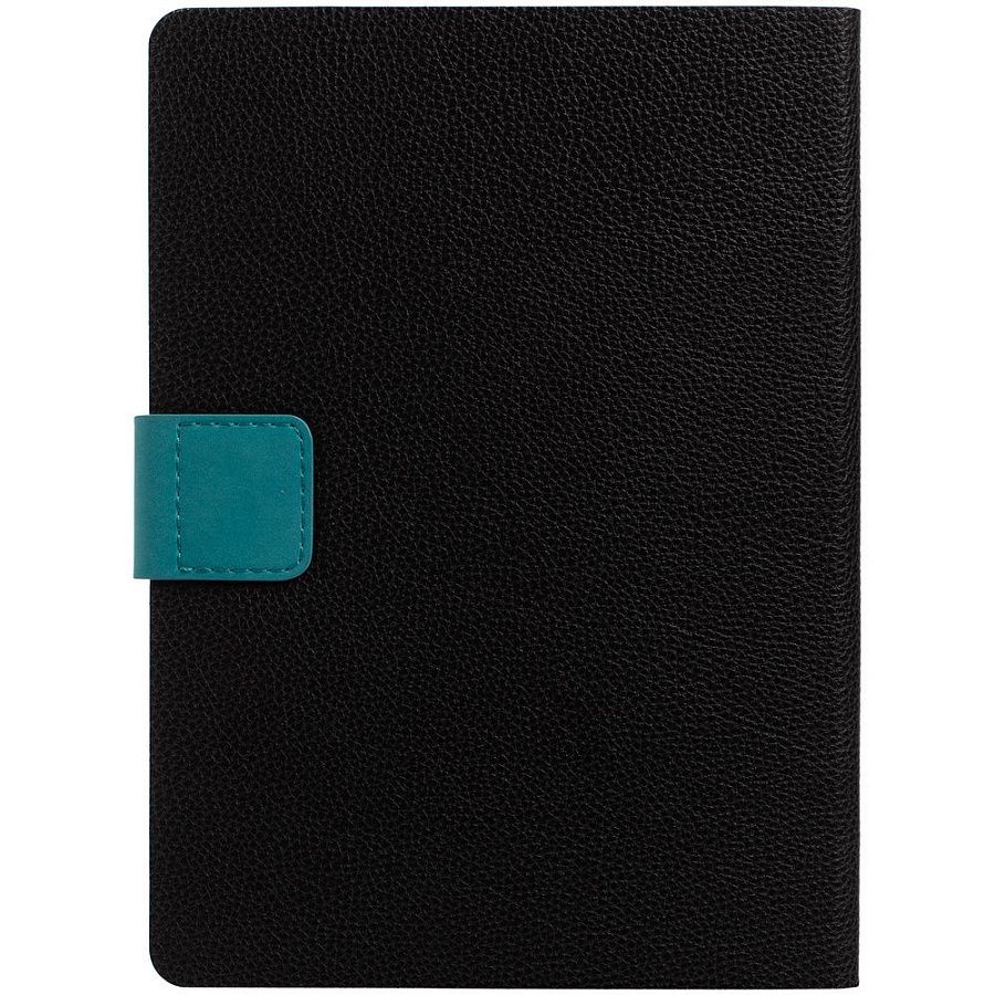 Ежедневник с гибкой обложкой, выполнен из материала La Fite, черный АА и Nubuck, цвет морской волны II, дополнен бирюзовым ляссе и хлястиком на кнопке.