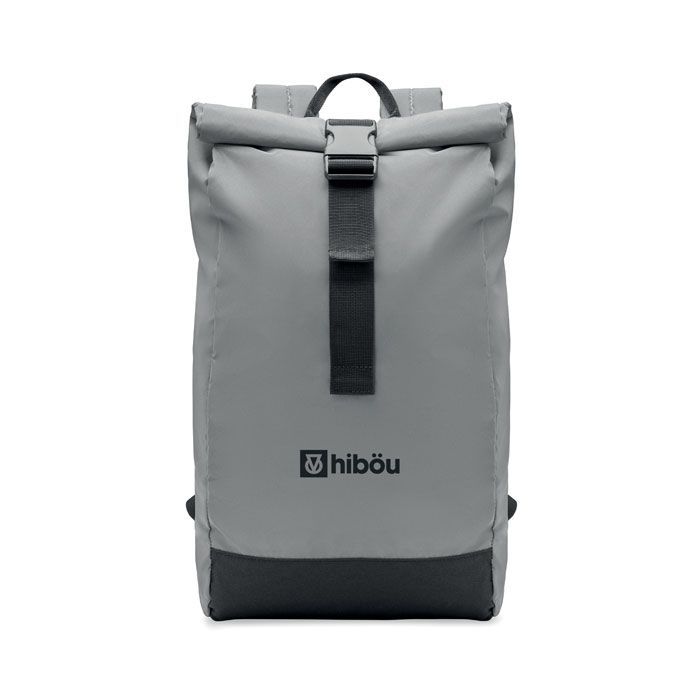 Рюкзак светоотражающий с отделением для ноутбука 15 дюймов из полиэстера 190T. Застежка rolltop. Спинка, лямки и дно с мягкой подкладкой. Передний боковой карман на молнии. Нижняя часть из переработанного полиэстера 600D.