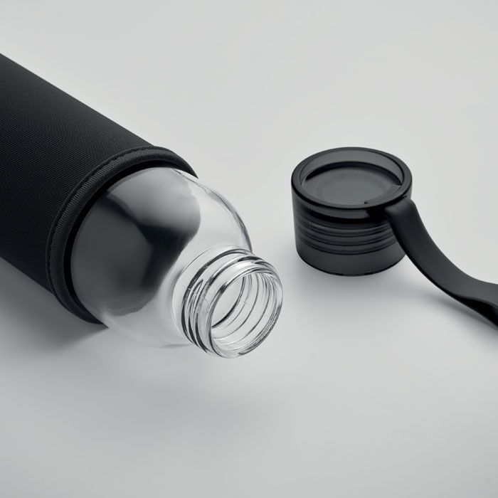 Бутылка из переработанного стекла с неопреновым чехлом и полипропиленовой крышкой с силиконовым держателем. Герметична. Емкость: 500 мл.