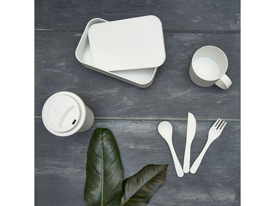 Ланч-бокс из PLA с силиконовым ремешком для регулировки. В комплекте вилка, ложка и нож. Емкость 1 л Наслаждайтесь едой в любом месте.