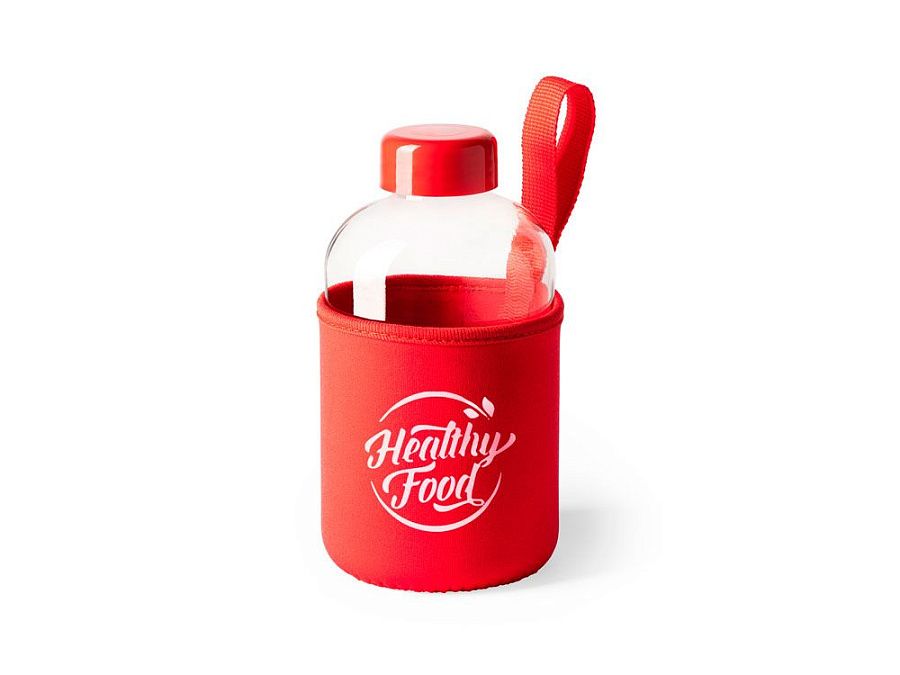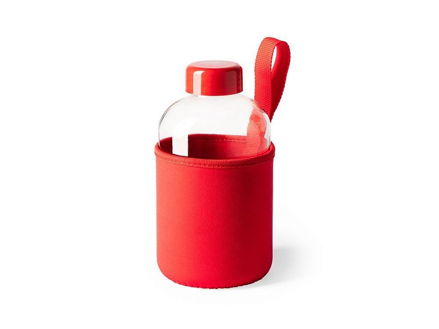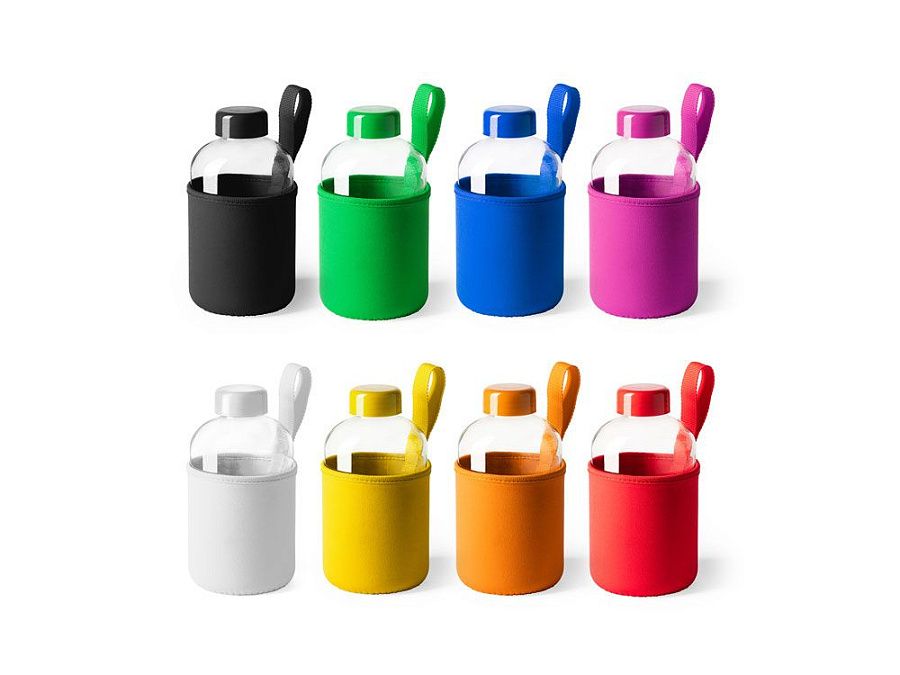 Стеклянная бутылка емкостью 600 мл. включает инновационный неопреновый чехол самых разных цветов с ручкой для переноски.