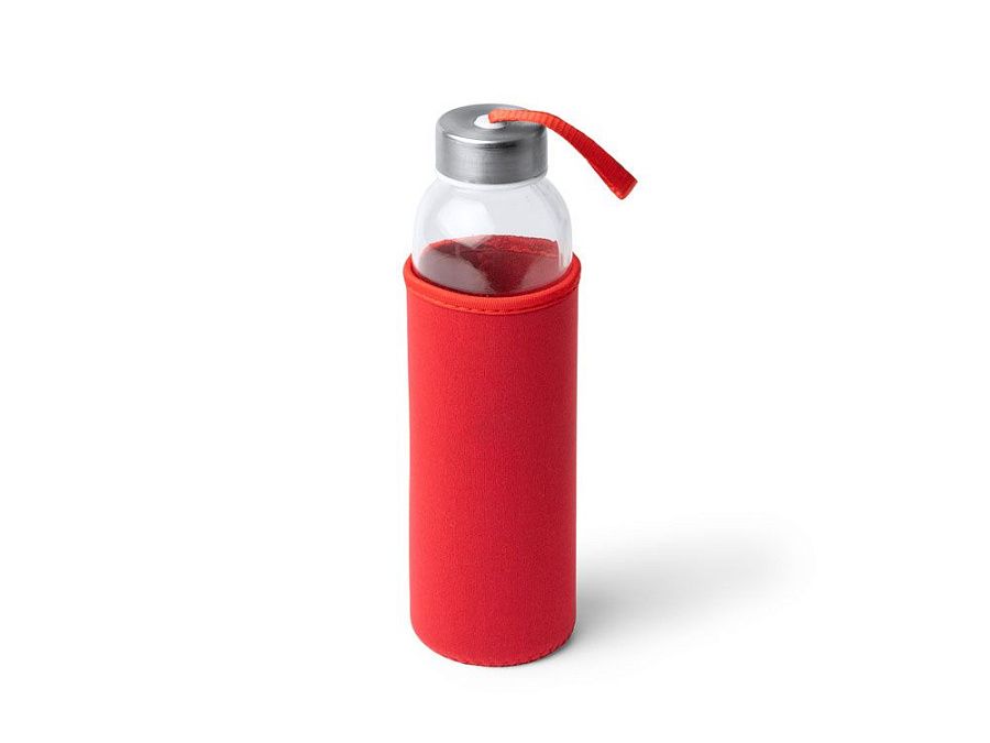 Стеклянная бутылка емкостью 500 мл, чехол из неопрена в сочетании с цветным ремешком для переноски.