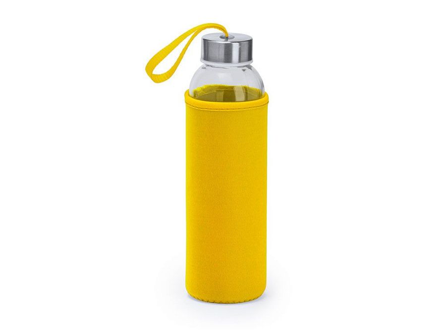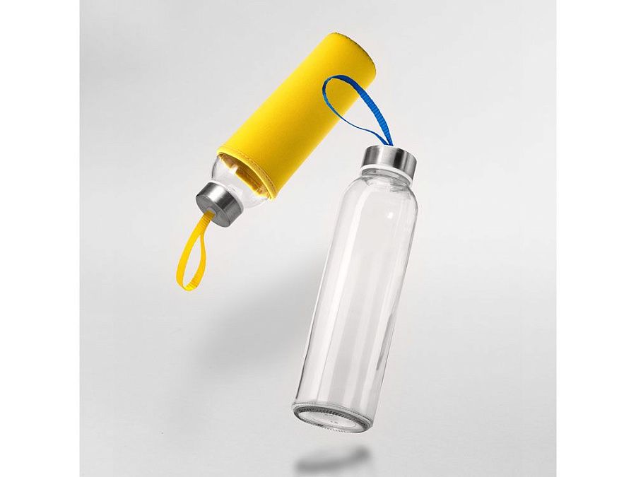 Стеклянная бутылка емкостью 500 мл, чехол из неопрена в сочетании с цветным ремешком для переноски.