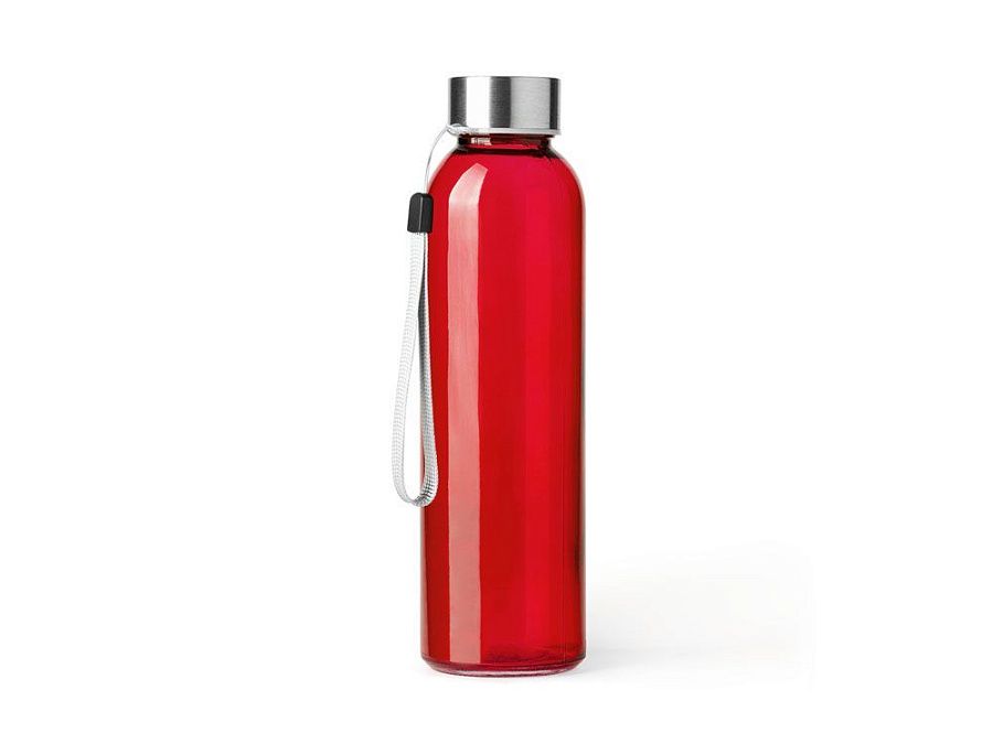 Стеклянная бутылка емкостью 500 мл. Большое разнообразие цветов, с завинчивающейся крышкой из нержавеющей стали и удобной для транспортировки благодаря ремешку серого цвета.
