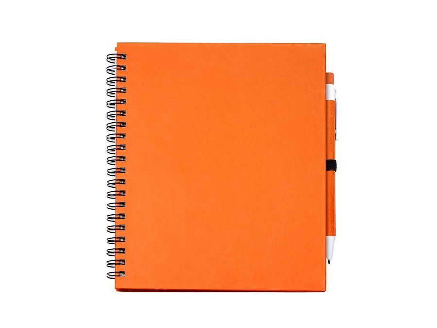 Блокнот на спирали с простыми листами и держателем для ручек. Твердая обложка и ручка из переработанного картона. 70 листов.