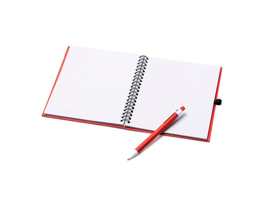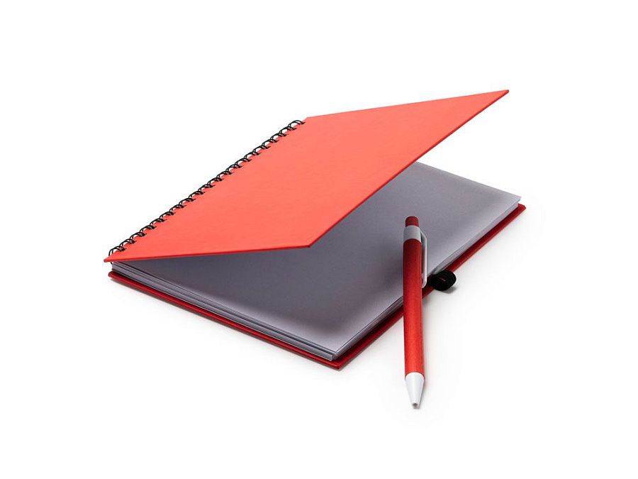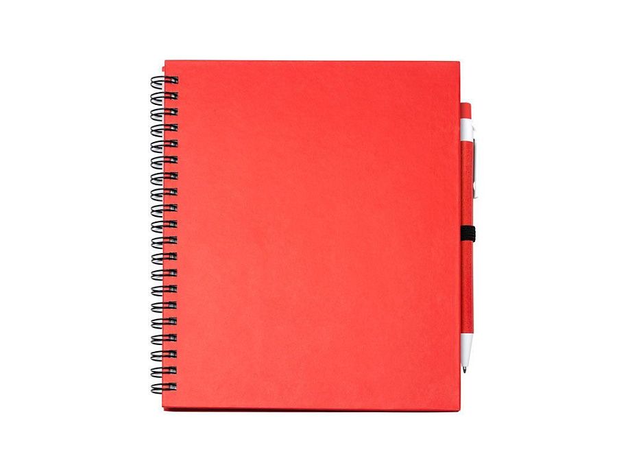 Блокнот на спирали с простыми листами и держателем для ручек. Твердая обложка и ручка из переработанного картона. 70 листов.