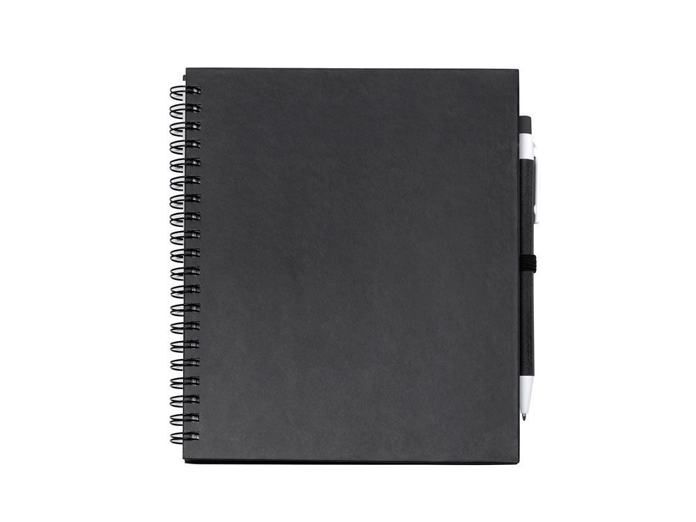 Блокнот на спирали с простыми листами и держателем для ручек. Твердая обложка и ручка из переработанного картона. 70 листов.