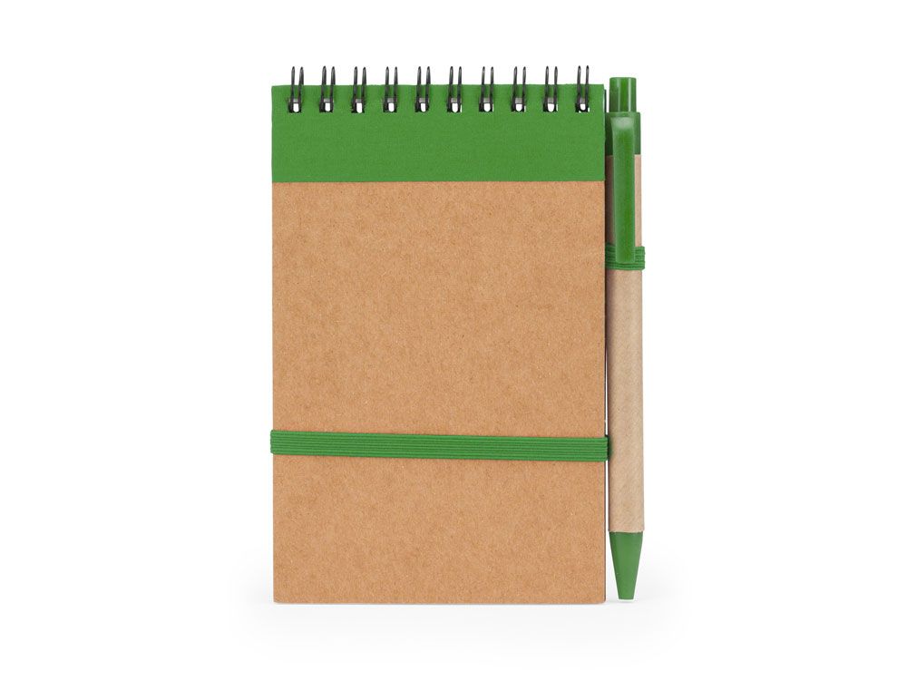 Блокнот на спирали с жесткой обложкой из переработанного картона. Включает шариковую ручку с синими чернилами. 70 листов.