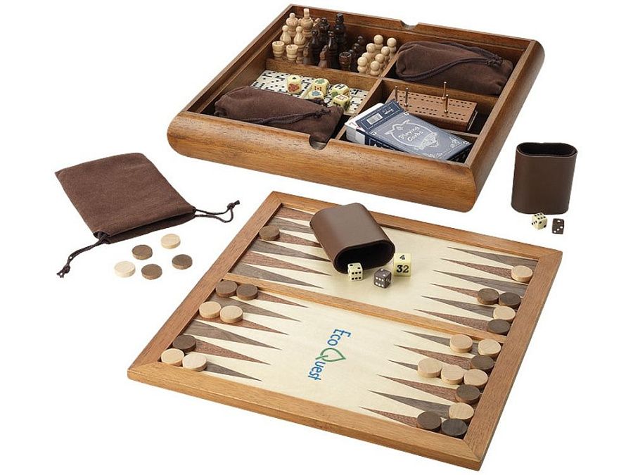 Роскошный подарок для человека с хорошим вкусом. Стилизация под антиквариат. Набор из 6 популярных настольных игр: шахматы, нарды, криббедж, игральные карты, домино, игральные кости. Футляр-игровое поле выполнен из натурального дерева. Отличный имиджевый сувенир в винтажном стиле.