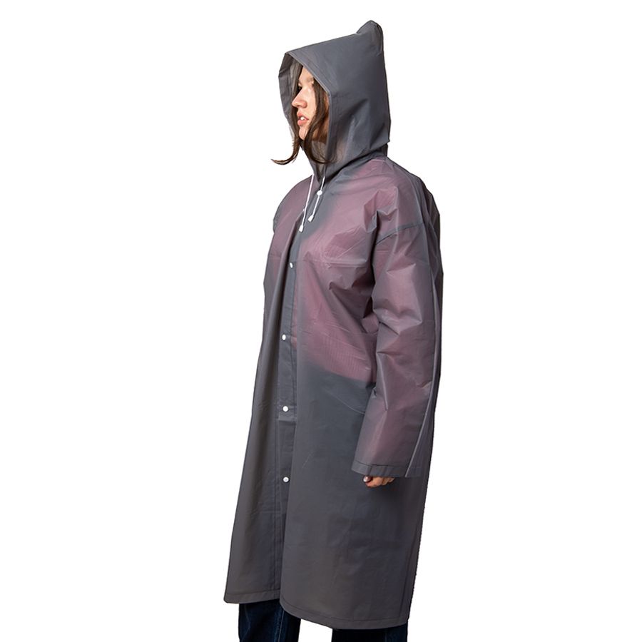 Дождевик "Pure" из непромокаемого материала EVA, толщиной 0,16 мм. Один размер, длина 118 см, ширина под грудью 68 см. Соответствует размеру XL-2XL. Прямой силуэт, втачной рукав, капюшон с завязками. Застёжка на кнопках, капюшон.Цвет близкий к пантону 433 U.