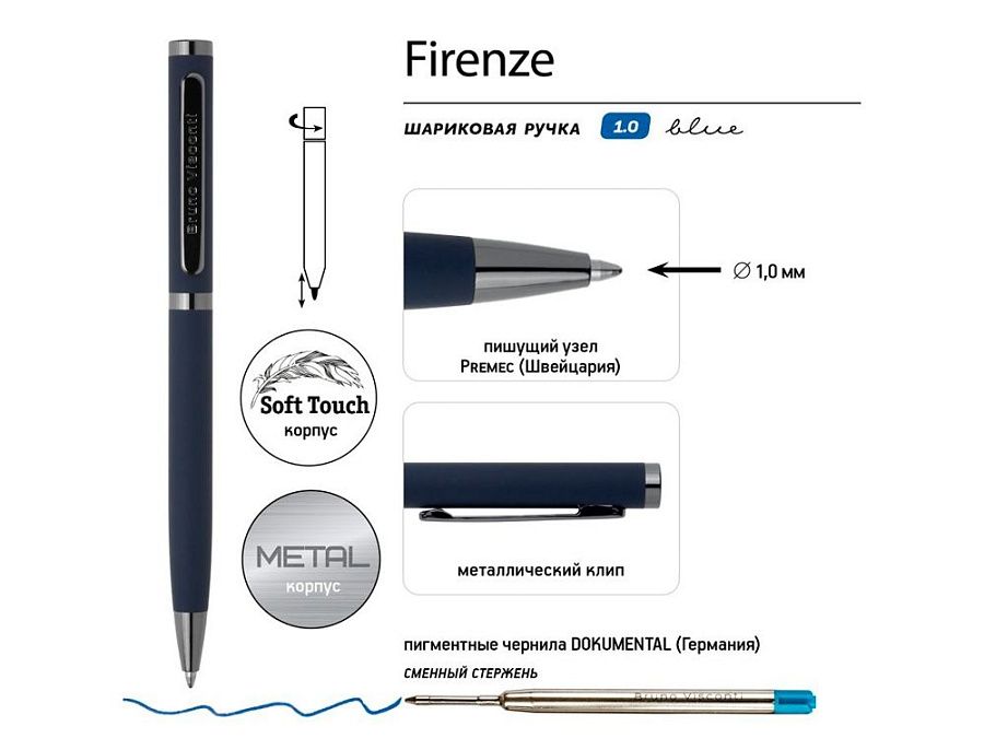 Ручка автоматическая, с легким поворотным механизмом подачи стержня. Надежный пишущий узел d 1,0 мм (от швейцарского производителя Premec) гарантирует высокое качество также, как и пигментные чернила Dokumental (Германия). Благодаря им писать ручкой «Firenze» одно удовольствие – она мягко скользит по поверхности бумаги, оставляя ровную, четкую линию.