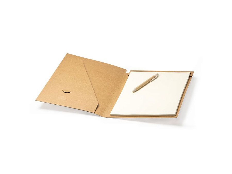 Папка из переработанного картона. Съемный блокнот на 20 листов, ручка в тон из пшеничного волокна, внутренний карман и картхолдер в комплекте.