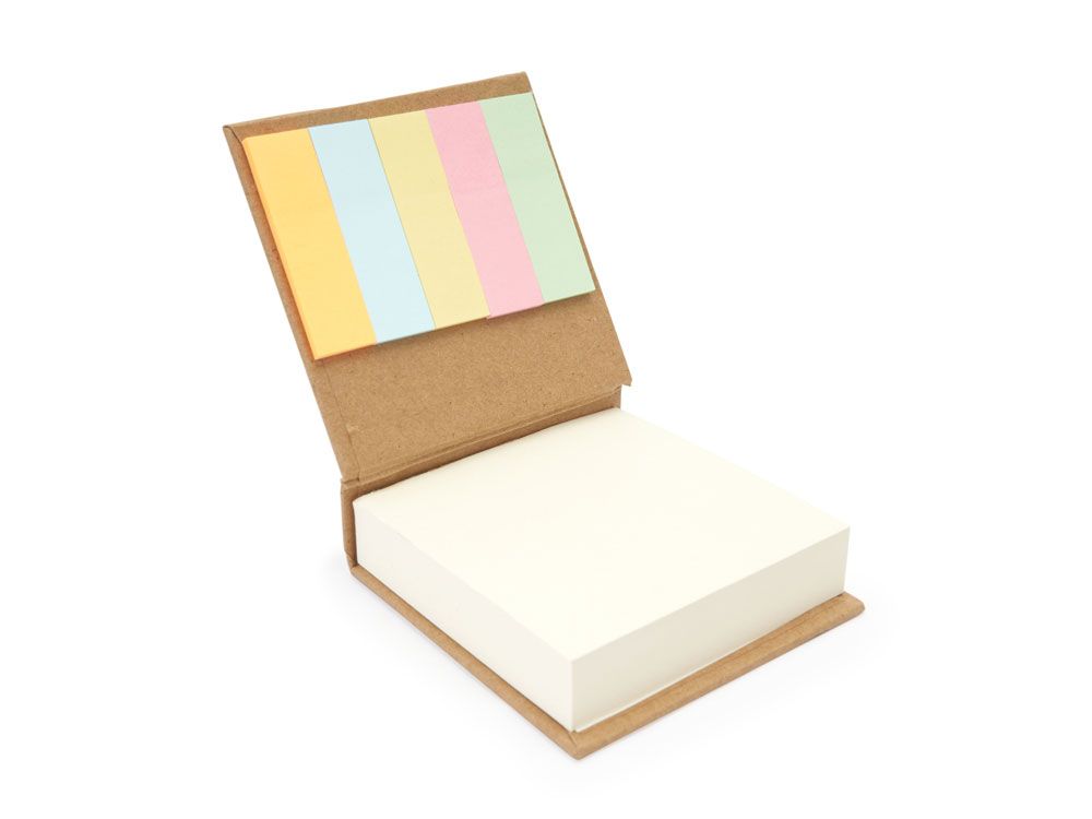 Блок для записей в обложке из переработанного картона. Включает 200 белых листов и 125 стикеров разных цветов.