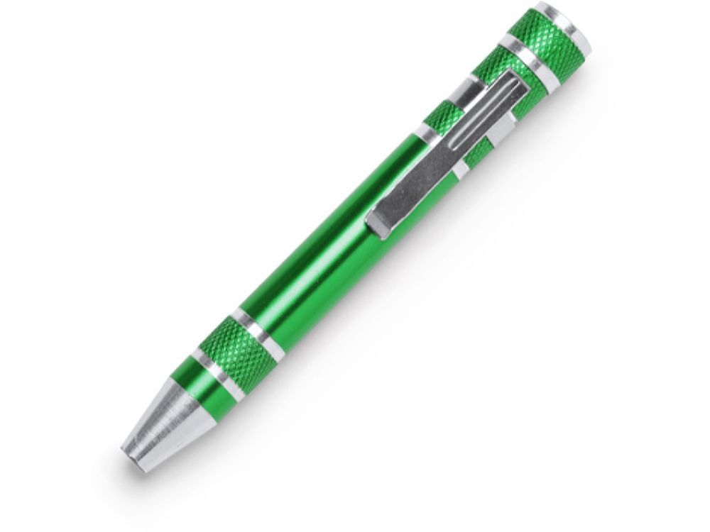 Алюминиевый мультитул в форме ручки. В комплекте 8 головок бит